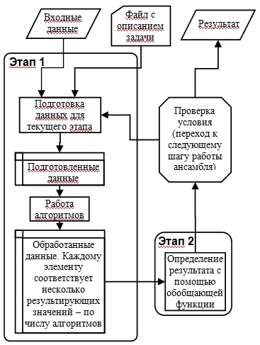 В общем случае после получения входных данных один или несколько раз выполняется следующая процедура: данные, подготовленные в соответствии с описанием задачи, передаются требуемым алгоритмам. Результаты работы алгоритмов передаются требуемой функции обобщения.